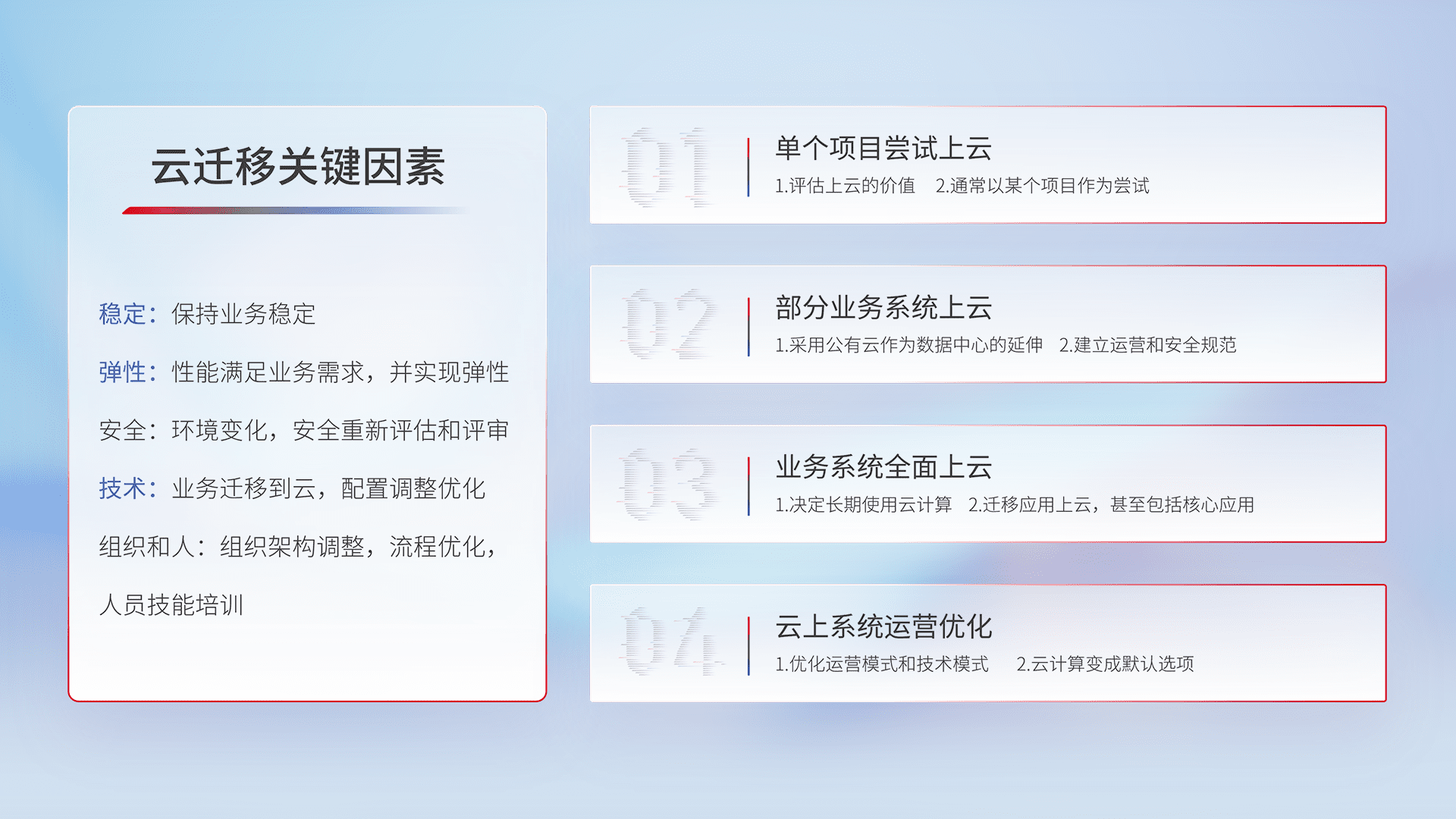 结合实际业务,,从规划设计、、云平台选型、、云原生改造、、数据迁移、、、、集成交付,,,迁移全过程为客户识别最佳上云路径,,做好风险识别管理,,,,设计网络架构、、身份权限、、安全审计合规、、、、操作审计、、、日志审计、、、监控告警策略、、、多站点容灾设计等,,对云上基础设施进行整体规划,,,,提升IT治理水平,,,以满足弹性、、、、高可用、、高性能的需求。。
