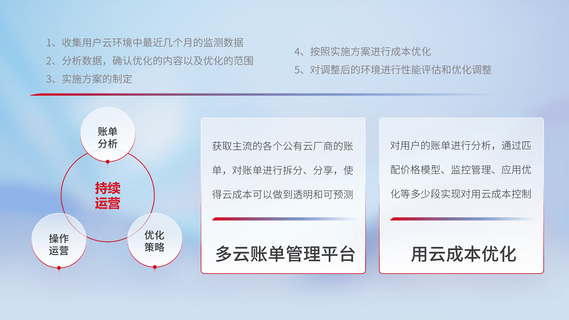 通过多云纳管,,以统一的资源数据模型把客户的云资源进行抽象和封装,,进而实现对多云资源的统一操作,,,保障云资源管理的可靠性、、、、稳定性与可用性。。。。量身定制化运维内容,,,,配置、、、、开发运维、、、、补丁管理、、、、备份、、监控、、认证和访问管理、、、审计和日常巡检等,,,保障在用云过程中的可靠度,,,稳定度以及高可用率。。。